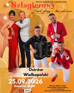 Zapraszamy Państwa na jedyny taki Koncert w Ostrowie Wielkopolskim ! Szlagierowy Zawrót Głowy – dwa pokolenia przyjedzie do Państwa już 25 Września. Ponad dwie godziny wspaniałej zabawy, dobrego humoru. Do miłego zobaczenia! Artyści, których Państwu przedstawiamy posiadają bogaty repertuar muzyczny, który trafia bezpośrednio do odbiorców i to w każdym wieku. Ich utwory usłyszeć można w różnych rozgłośniach radiowych, ponadto współpracują z wieloma ośrodkami telewizyjnymi w całym kraju, a w szczególności z telewizją TVS Silesia, Polo TV, TV Trwam, TV Katowice, TVT i TVC, gdzie są stałymi gośćmi. O Nas: Mirosław Szołtysek – prawdziwa legenda śląskich szlagierów. Urodzony w Wielkich Hajdukach, czyli Chorzowie Batorym, Ślązak z krwi i kości, pochodzący z tradycyjnej śląskiej Rodziny, Laureat nagród Hanysy, Śląska Perła Telewizji TVS, a także osobowość Roku Miasta Chorzów. Uczestnik Letniej Trasy Dwójki TVP, gdzie zaprezentował się milionom widzów przed telewizorami jako prawdziwa „Śląska Perła”. Wokalista i tekściarz. Na scenie występuje z żoną Bożeną. MarsaAlam – Profesjonalny duet dwóch młodych i energicznych muzyków, wyróżniających się klasą oraz oryginalnością. W roku 2025 wydali swoją trzecią autorską płytę. Na rynku muzycznym od 7 lat. Ostatnia nowość zespołu, piosenka „Mój magiczny świat” przyniosła ich spory sukces. Utwór w szybkim tempie podbija stacje radiowe i telewizyjne. Wszystkie utwory melodyjne i szybko wpadające w ucho. Mają na swoim koncie wiele koncertów. Teledyski Mirosława Szołtyska jak i zespołu MarsaAlam dostępne na YouTube, profil Szlagiery.TV.