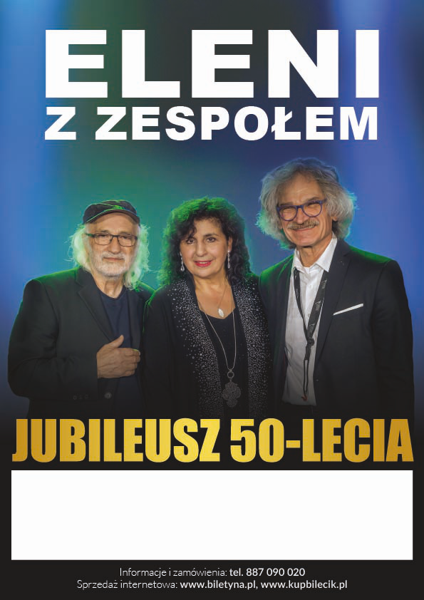 Zapraszamy państwa serdecznie na wyjątkowy, jubileuszowy koncert Eleni z zespołem. Będzie to muzyczna podróż z największymi przebojami piosenkarki ,które śpiewa od 50 lat. Usłyszymy piosenki zespołu Prometusz takie jak „Po słonecznej stronie życia”, „Ballado hej, ballado niepokorna” , w którym Eleni rozpoczynała karierę. Przeboje takie jak: „Miłość jak wino”, „Troszeczkę ziemi troszeczkę słońca”, ,”Po słonecznej stronie życia, a słońce sobie lśni” – to kulminacja koncertu. Nostalgiczne, pełne refleksji piosenki: „Nic miłości nie pokona” oraz „Nim świt obudzi noc” – to druga część koncertu zakończona wiązanką przebojów greckich oraz zorbą. Trzecia część koncertu to największe przeboje lat 90 -tych oraz na zakończenie grecka piosenka w podziękowaniu publiczności za 50 lat obecności.